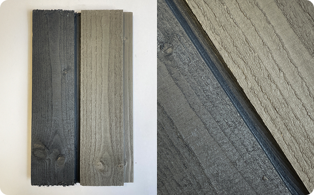 Dažytos lentos – pilnas spalvos padengimas, nematomas medienos raštas, prieš spalvos atnaujiną, reikia pašalinti atšokusius dažus, nuvalyti, perdažyti.
